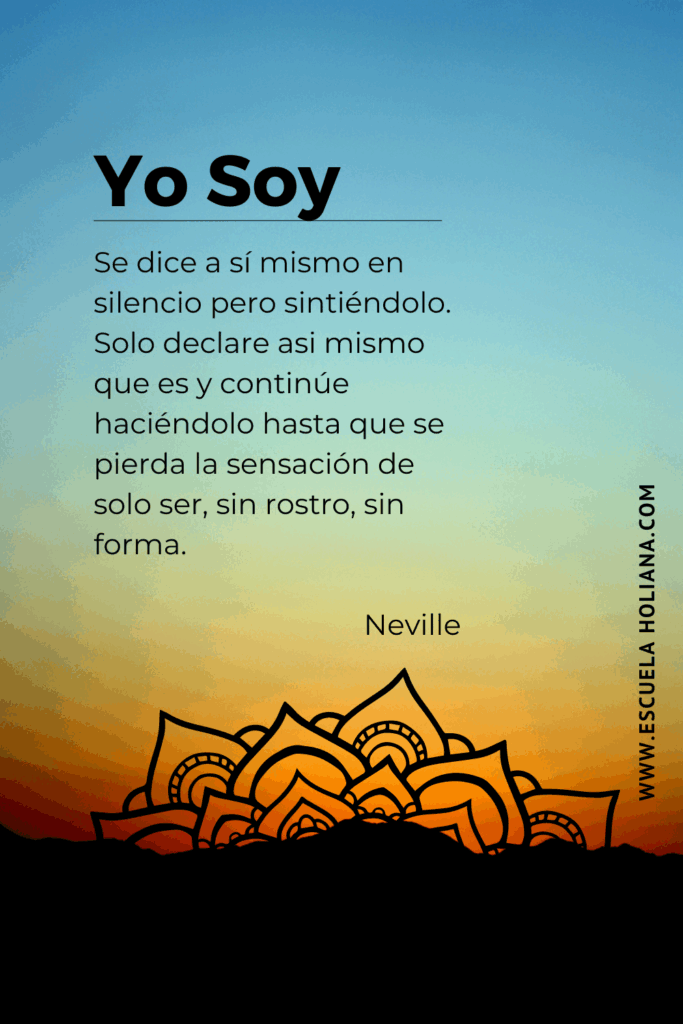 Neville dijo: “Yo soy, se dice a sí mismo en silencio, pero sintiéndolo. Solo declare así mismo que es y continúe haciéndolo hasta que se pierda la sensación de solo ser, sin rostro, sin forma\».